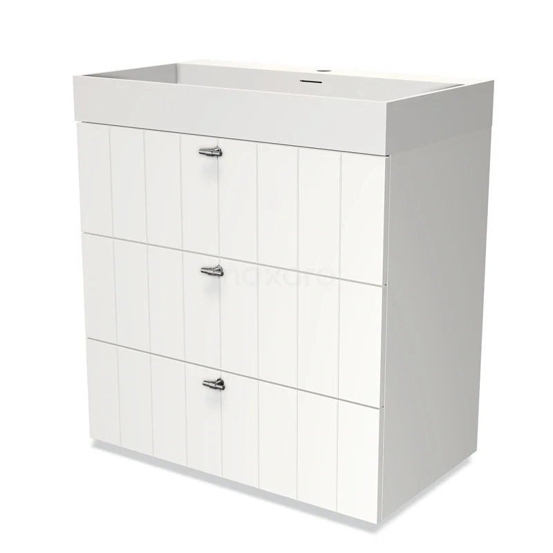 Stylish design The stylish design makes this bathroom unit the eye-catcher of your bathroom. The base cabinet features a slatted front and has a matte white finish. This colour has a modern appeal and gives the unit a fresh look and feel. In addition, the slatted front adds a rustic touch. NO TEXT FOUND.