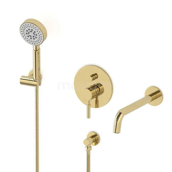 This built-in bath tap with mixer from the Radius series must not be missing in your bathroom. This model is equipped with a hand shower and shower hose. The thermostatic tap has a luxurious design and is finished in shiny light gold. The timeless appearance of this tap fits perfectly in any bathroom style.
