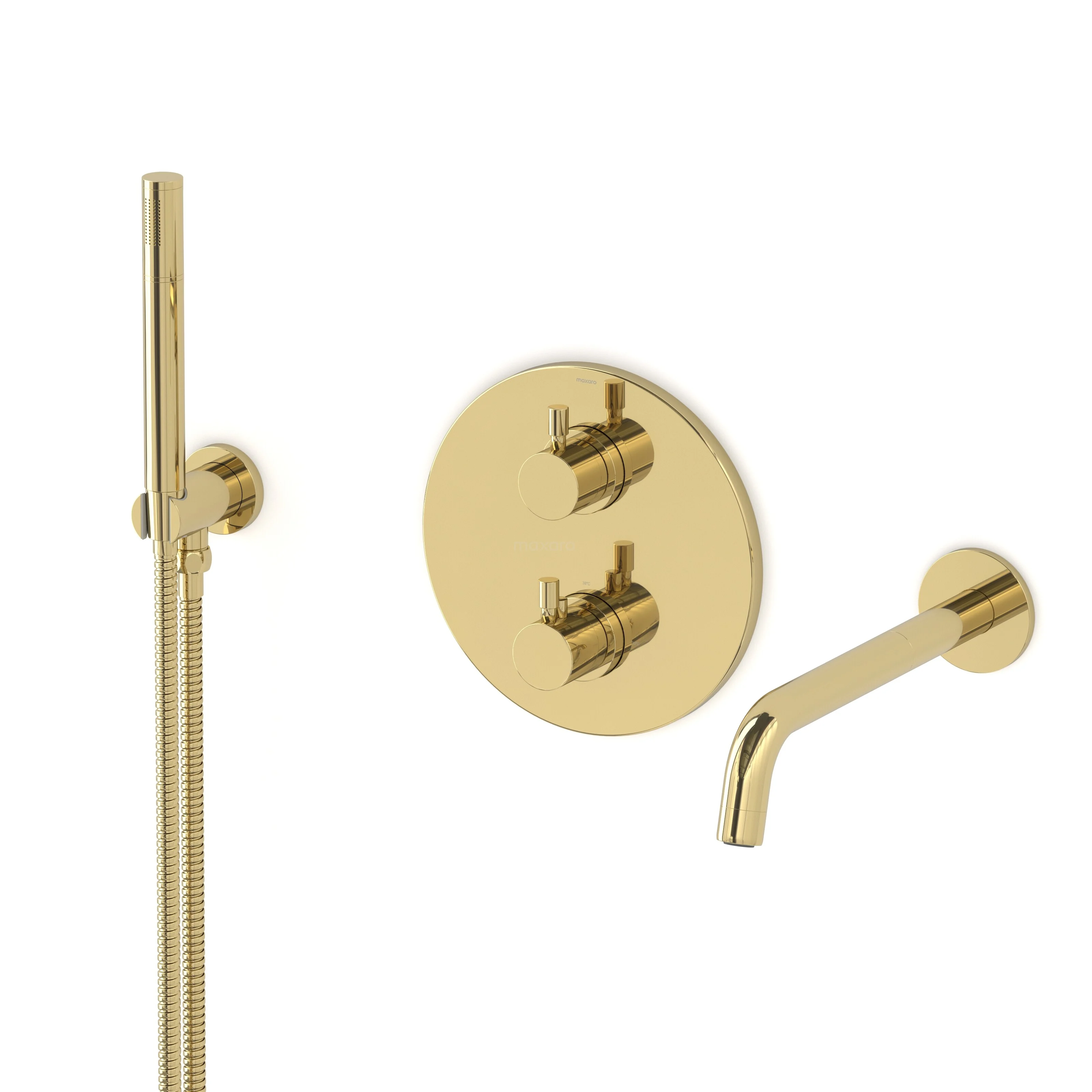 This built-in bath tap with thermostat from the Radius series must not be missing in your bathroom. This model is equipped with a hand shower and shower hose. The thermostat tap has a luxurious design and is finished in shiny light gold. The timeless appearance of this tap suits every bathroom style.