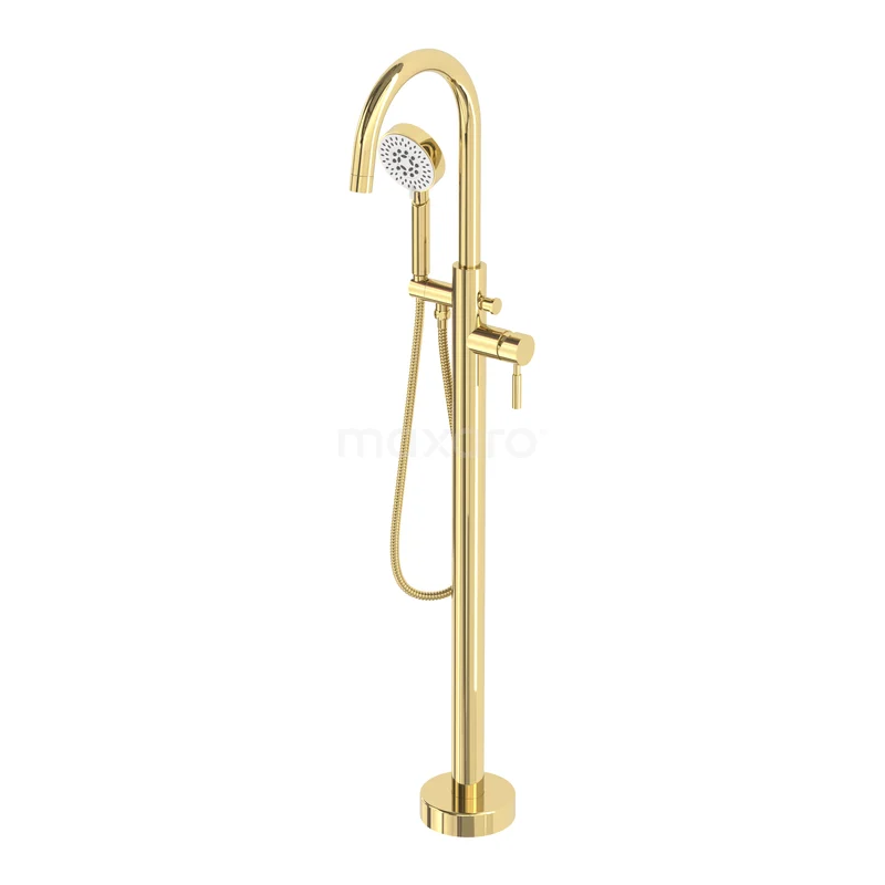 This freestanding bath tap from the Radius series is a trendy addition to your bathroom interior. This stylish piece is equipped with a hand shower holder, round hand shower, and shower hose, and features Easy Clean. This allows you to make the flow regulator lime-free with a single finger movement and experience optimal maintenance convenience. The single-lever mixer tap has a round design and is finished in glossy light gold. With this beautiful colour, your bathroom gets a luxurious touch.