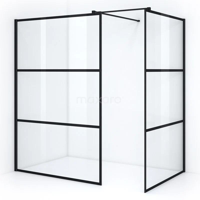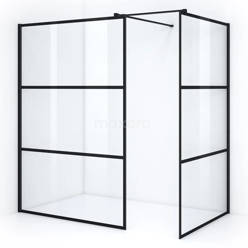 - 2 Fixed walls with wall profile and stabilising bar with extended T-piece, for connecting 2 glass walls.