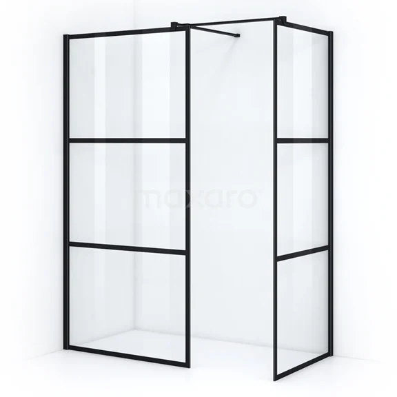 - 2 Fixed walls with wall profile and stabilising bar with extended T-piece, for connecting 2 glass walls.