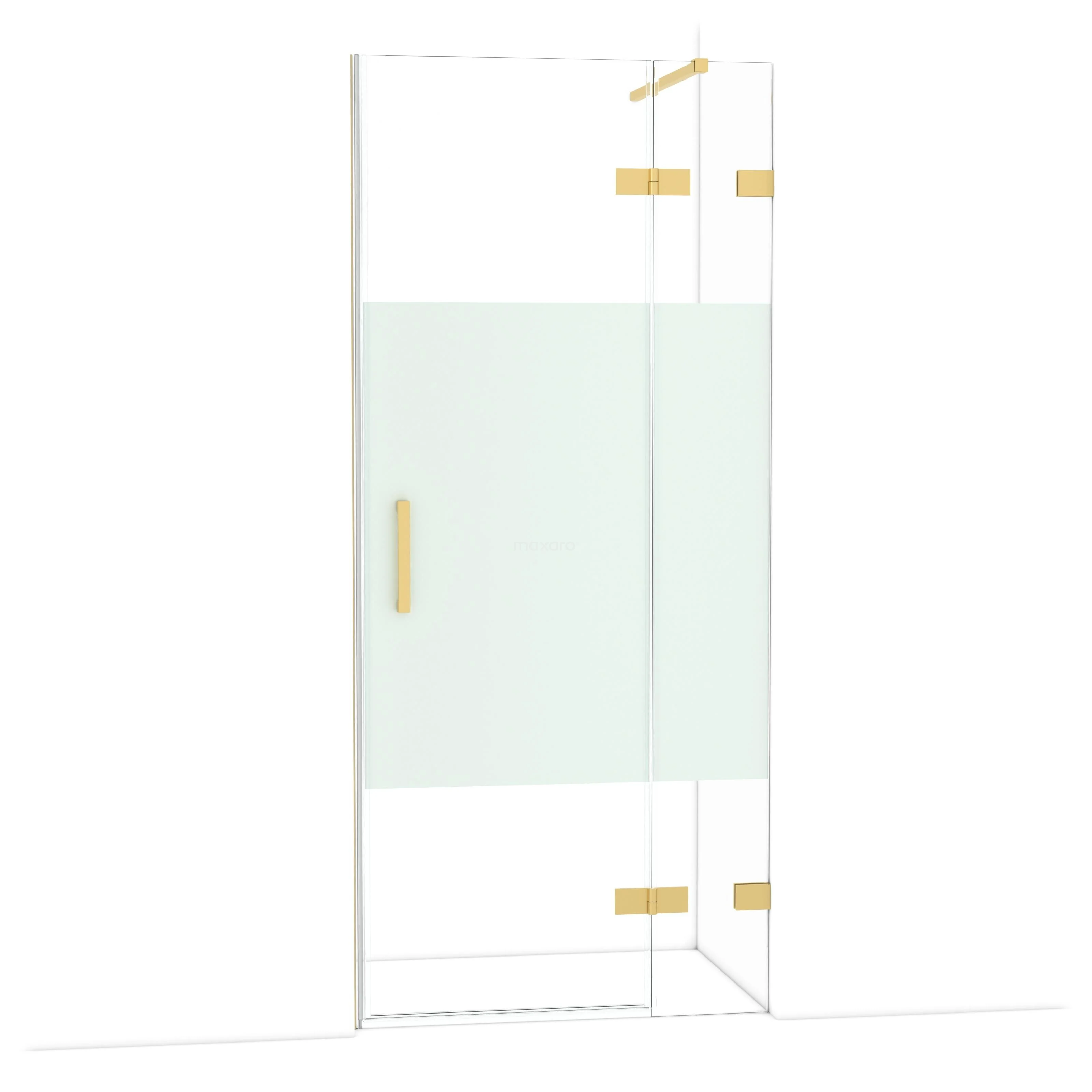 De Diamond-draaideur van 90 cm is ideaal om jouw douchenis af te sluiten. Dit exemplaar heeft een luxe design van goud en is voorzien van hoogwaardige scharnieren, tweepuntsbevestiging en een verticaal handvat. Het helder glas met matte strook zorgt voor meer privacy. Door de verstelbaarheid maak je de douchedeur gemakkelijk passend. De totale breedte is verstelbaar van 89,7 tot en met 90 cm.