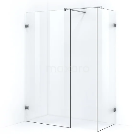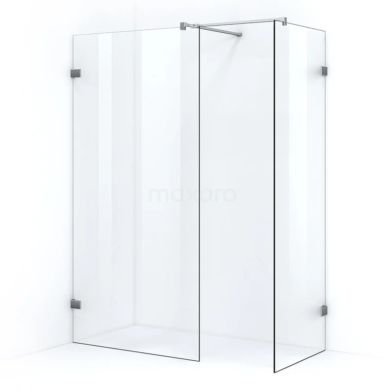 - 2 Fixed walls with stainless steel fixing points and stabilising bar with extended T-piece, for connecting 2 glass walls together.