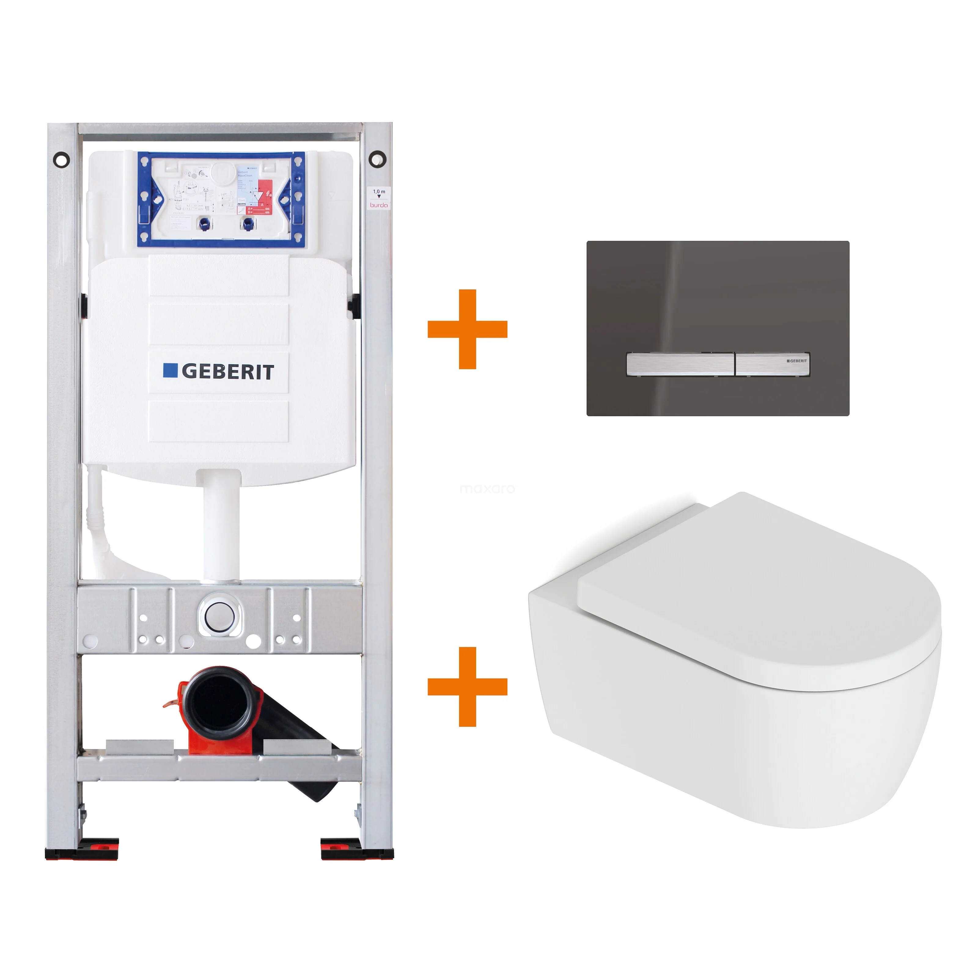 Built-in toilet set with white ceramic wall hung toilet, grey control plate and frame from the Geberit Sigma Series, ideal for modern bathrooms.